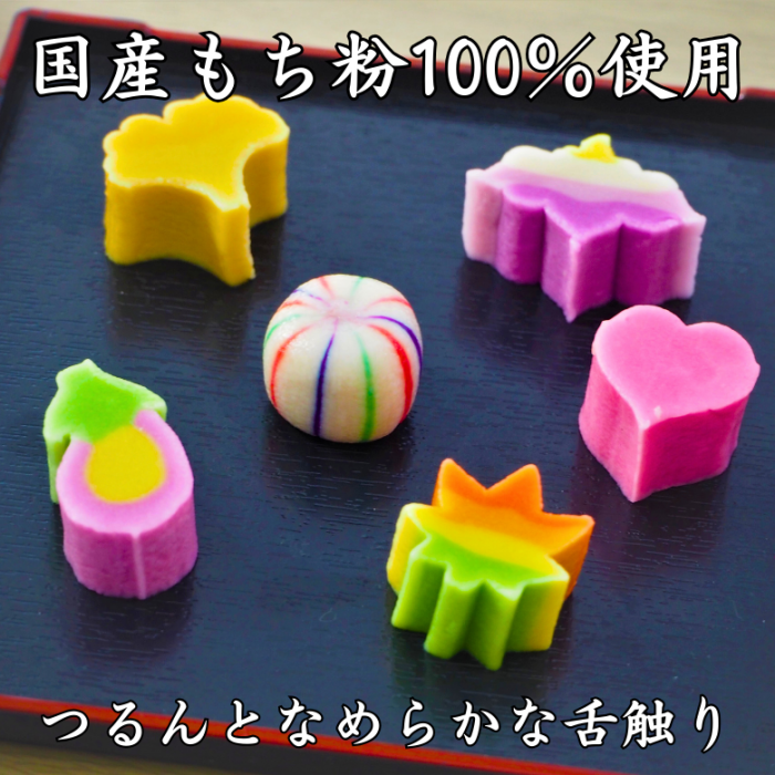 原材料 :小麦グルテン(国内製造)、もち粉(国産)/着色料(黄5、赤104、青1、赤3、赤102、赤106、黄4)
